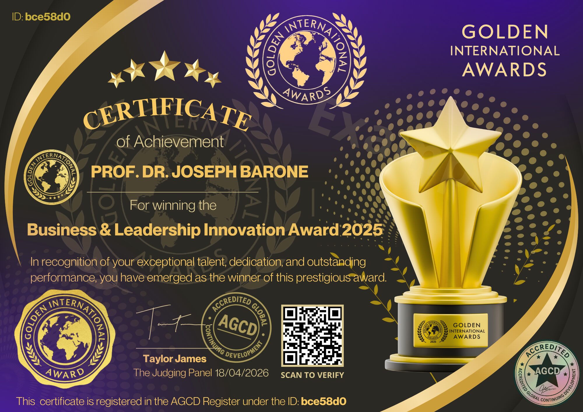 Prof. Dr. Joseph Barone, PhD (Pontifical), PhD Fellow, D.Sc., DSL, DBA, D.Univ., Dr.Exc., D.EngTech, D.Litt., HonPhD, Post‑Doctorate, MBA, MSc (Lean Systems), BSc (Business), Master Black Belt (Lean Six Sigma), Doctoral Fellow, Board Certified Specialist in Organization & Business Consulting, Certified Professional in Business Psychology, Ambassador for Peace & Human Rights, Professorial Fellow, Professor of Business and Leadership, FDip‑OXCEL, FEAU, FWOU, Knight of the Crown of Thorns, Distinguished Scholar, Professor & Professor of Practice, Published Author